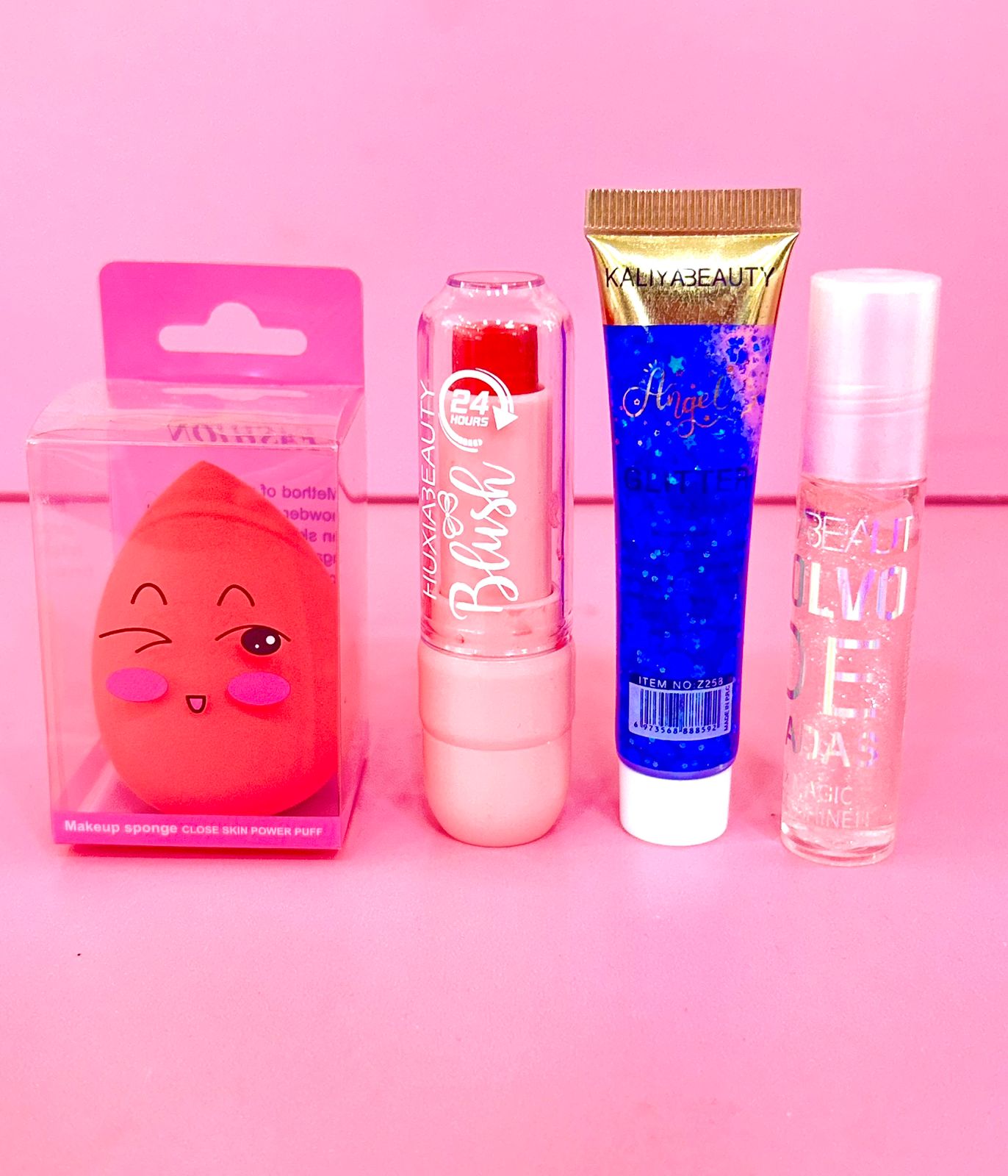 COMBO MINI – BEAUTY BLENDER, RUBOR EN BARRA, GLITTER, GLOSS